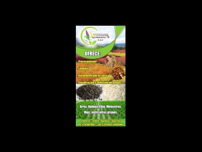 Somos la empresa procesadora de granos “Agroindustria TB”. Brindamos el servicio de limpieza, selección y envasado desde cereales como arroz, maíz, así como granos de Quinoa, kiwicha, Chia, Soja, etc; hasta legumbres, menestras y semillas.